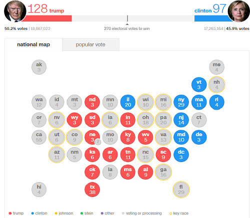 Tính tới thời điểm hiện tại, đã có 24 bang công bố kết quả, bên cạnh đó Trump chắc chắn thắng tại 15 bang, Clinton chắc chắn thắng tại 9 bang.