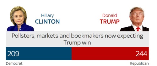 Theo nguồn tin từ Sky News, ông Trump hiện giành 244 phiếu đại cử tri, trong khi đó, bà Clinton có 209 phiếu.