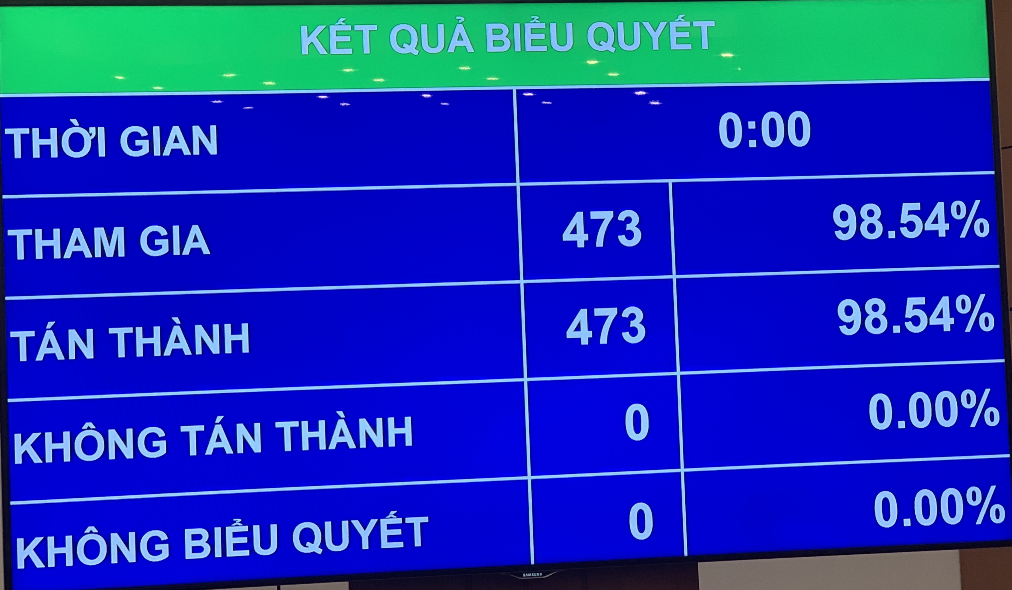 Nghị quyết công nhận kết quả kiểm phiếu được 100% đại biểu Quốc hội có mặt (473 đại biểu) tán thành thông qua ngay sau đó.