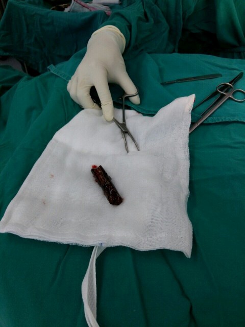Sau khi thăm khám vết thương, các bác sĩ đã phát hiện có dị vật nằm trong vai bệnh nhân, hướng từ dưới nách lên tới xương đòn. Các bác sĩ đã tiến hành ca phẫu thuật khẩn cấp.