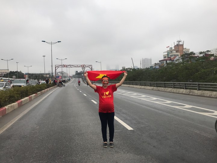 | Một người hâm mộ mặc dù bụng bầu vẫn muốn có giây phút được chào đón các chàng trai U23 Việt Nam |