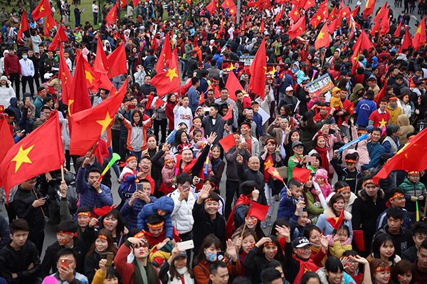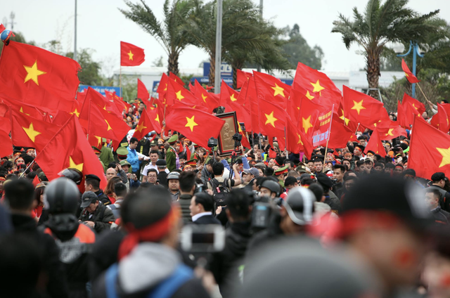 Cờ tổ quốc tung bay giữa dòng người náo nhiệt, chào đón các tuyển thủ. Ảnh: Dân trí |