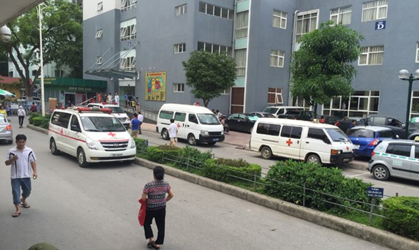 Xe cứu thương của các đơn vị khác nhau trong khuôn viên BV Việt Đức. Ảnh: T. Hoàng. |