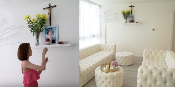 Một khu vực vô cùng đặc biệt là nơi đặt bàn thờ mẹ của Ngọc Trinh. Cô cho biết mình thắp hương mỗi sáng và đây là thói quen không bao giờ quên. |