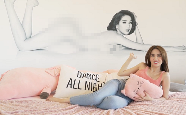 Ngọc Trinh tiết lộ cô đặt rất nhiều gương trong phòng vì thích ngắm cơ thể mình bên trong. Ngoài ra, có một bức ảnh chụp nude của "Nữ hoàng nội y" cũng đặt ngay trên phía giường của cô. |