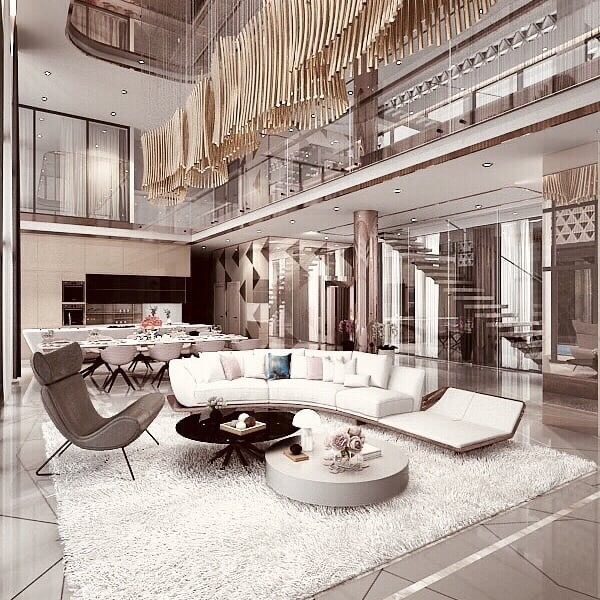 Không gian phòng khách và phòng bếp của căn biệt thự được thiết kế sang trọng. |