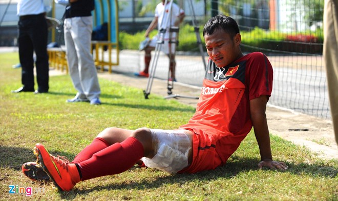 | Trong buổi tập sáng nay của ĐTVN, tiền vệ Trọng Hoàng đã gặp phải chấn thương đùi trong một pha tranh chấp bóng với đồng đội. Tiền vệ gốc SLNA sẽ được các bác sĩ theo dõi trước khi quay trở lại tập luyện cùng toàn đội. |