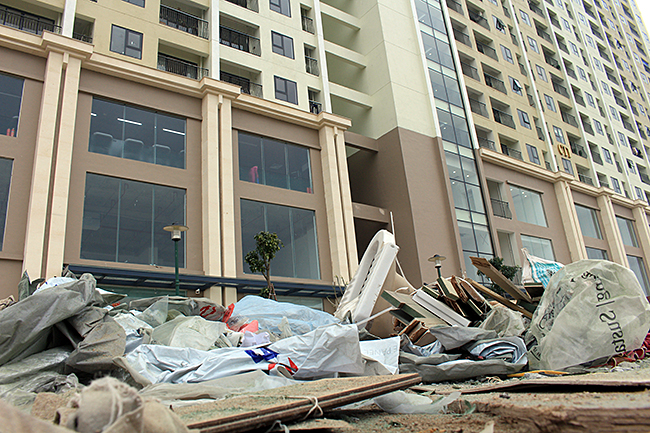Khu tầng trệt và các tầng thương mại vẫn trong tình trạng nhếch nhác, chưa hoàn thiện. |