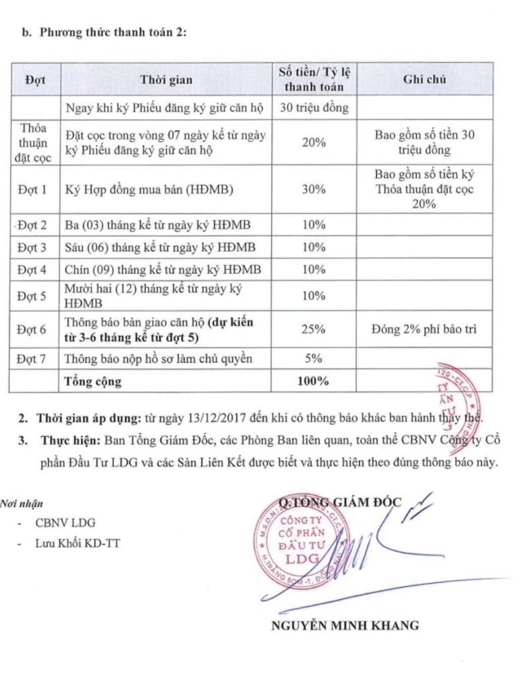 Tim theo một số điện thoại trên các website quảng cáo, nhập vai là người mua căn hộ, PV đã liên hệ được với nhân viên tên H thuộc sàn giao dịch bất động sản LDC Group (thuộc công ty Cổ phần Đầu tư LDC) anh này nhiệt tình tư vấn: “Dự án bên em có tổng 540 căn hộ, mở bán đợt 1 từ đầu năm đến nay đã bán được 490 căn, hiện tại chỉ còn 50 căn cuối cùng. Dự án đang mở bán tiếp đợt 2, thời điểm này khách hàng đầu tư là hợp lí nhất vì dự án đang lên hình hài căn hộ. Đa số những căn còn lại diện tích khoảng 64m2 bao gồm: 2 phòng ngủ, 2 toilet và có ban công, với giá bán 29-30 triệu/m2 (đã tính VAT) chiết khấu 3% cho khách hàng”.
