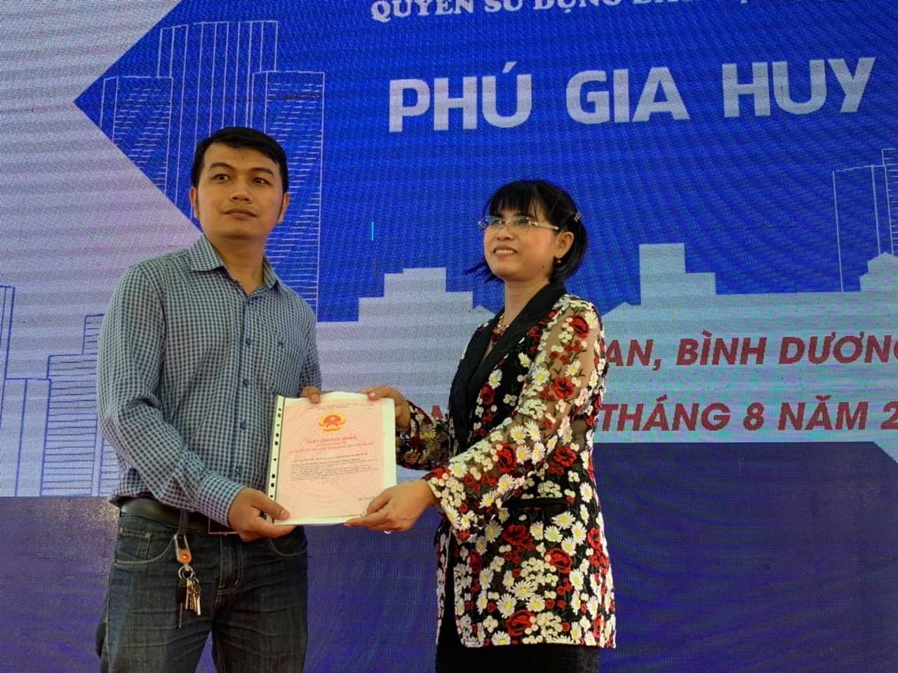 Sáng 10/8, Công ty TNHH Bất động sản Phú Hồng Thịnh long trọng tổ chức buổi lễ bàn giao 329 giấy chứng nhận quyền sử dụng đất cho các khách hàng thuộc dự án khu nhà ở Thương mại Phú Gia Huy với tổng diện tích 37.822,2 m2 tại Khu phố Bình Phước B, phường Bình Chuẩn, thị xã Thuận An, tỉnh Bình Dương.