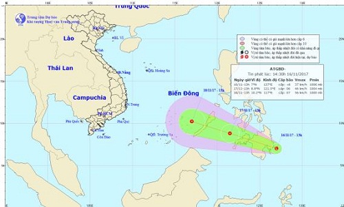 Cảnh báo áp thấp nhiệt đới di chuyển theo hướng Tây Tây Bắc với tốc độ 25km/h, tiếp tục mạnh lên và có khả năng đi vào Biển Đông trong đêm ngày 17/11.