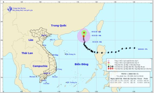 Theo Trung tâm Dự báo Khí tượng Thủy văn Trung ương, hồi 4h ngày 2/11, vị trí tâm bão số 7 (bão Yutu) ở vào khoảng 21,1 độ Vĩ Bắc; 116,6 độ Kinh Đông, cách quần đảo Hoàng Sa 650km về phía Đông Bắc. Sức gió mạnh nhất vùng gần tâm bão mạnh cấp 8 (60-75km/giờ), giật cấp 10. Phạm vi gió mạnh cấp 6, giật cấp 8 trở lên khoảng 150km tính từ vùng tâm bão.