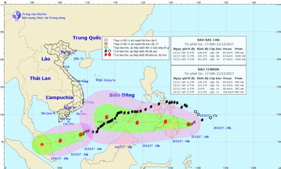 Cũng theo Trung tâm dự báo, vào hồi 16h ngày 21/12, vị trí tâm bão Tembin ở vào khoảng 8,2 độ Vĩ Bắc; 128,2 độ Kinh Đông, cách bờ biển phía Đông khu vực miền Nam Philippines khoảng 220km. Sức gió mạnh nhất ở vùng gần tâm bão mạnh cấp 9 (75-90km/giờ), giật cấp 12.