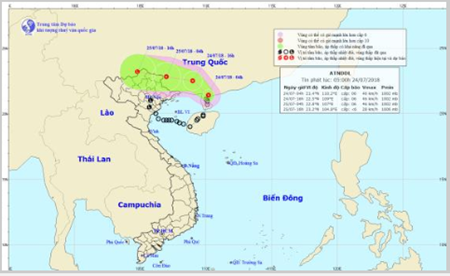 Theo Trung tâm Dự báo Khí tượng Thủy văn Trung ương, hồi 04h ngày 24/7, vị trí tâm áp thấp nhiệt đới ở khoảng 21,4 độ Vĩ Bắc; 110,2 độ Kinh Đông, trên khu vực phía Bắc bán đảo Lôi Châu (Trung Quốc). Sức gió mạnh nhất vùng gần tâm áp thấp nhiệt đới mạnh cấp 6 (40-50km/giờ), giật cấp 8. Phạm vi gió mạnh cấp 6, giật cấp 8 khoảng 50km tính từ tâm áp thấp nhiệt đới.