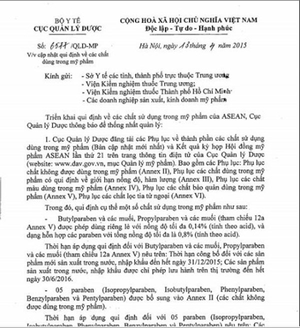 Th?i h?n �p d?ng quy ??nh ??i v?i 05 paraben (Isopropylparaben, Isobutylparaben, Phenylparaben, Benzylparaben v� Pentylparaben) n�u tr�n: C�c s?n ph?m s?n xu?t trong n??c, nh?p kh?u c� ch?a c�c th�nh ph?n n�y ch? ???c ph�p l?u h�nh tr�n th? tr??ng ??n h?t ng�y 30/7/2015.