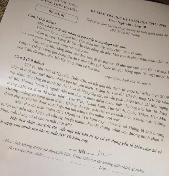 Trước đó, như thông tin ban đầu đã đưa, đề thi Ngữ văn lớp 10 của Trường THPT Hạ Hòa (Phú Thọ) gặp phải những ý kiến bình luận trái chiều từ dư luận khi đưa Chi Pu vào.