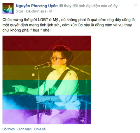 Rất nhiều sao Việt như Đặng Thu Thảo, Xuân Lan, Phương Thanh, Nguyên Vũ... cũng đổi avatar và có những chia sẻ hết sức xúc động về tình yêu, niềm hi vọng của cộng đồng LGBT.