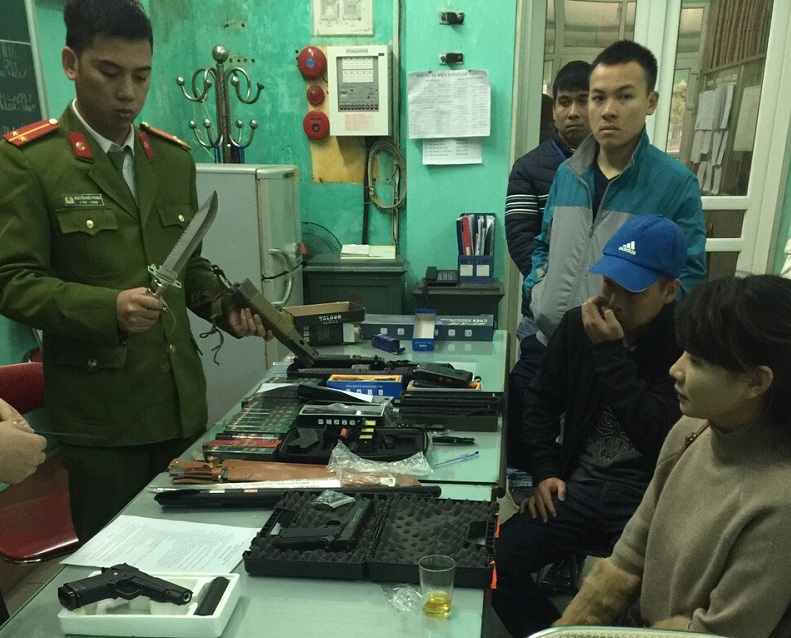 Qua kiểm tra, lực lượng Công an Móng Cái phát hiện và thu giữ tại quầy hàng 04 + 05 của chị Nguyễn Thị Ngừng (sinh năm 1989, trú tại thôn 8, xã Hải Đông, thành phố Móng Cái) 3 dùi cui điện hình chữ nhật, nhãn hiệu 928TYPE; 5 gậy rút ba khúc hình trụ, 17 bình xịt hơi cay, nhãn hiệu NaTo; 2 đèn pin chiếu sáng đầu có gắn dùi cui điện; 2 dao bấm; 1 súng bắn bi, báng bằng nhựa, nòng bằng kim loại; 1 súng bắn điện (kèm 3 viên đạn); 2 kiếm sắt; 1 dao dài; 1 típ sắt và 3 dùi cui điện hình trụ có đèn pin chiếu sáng.