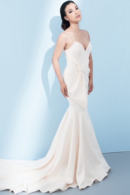 Người đẹp chọn kiểu tóc vuốt ngược phía sau cùng cách tạo dáng đơn giản để toát lên vẻ nữ tính mà bộ trang phục muốn truyền tải.