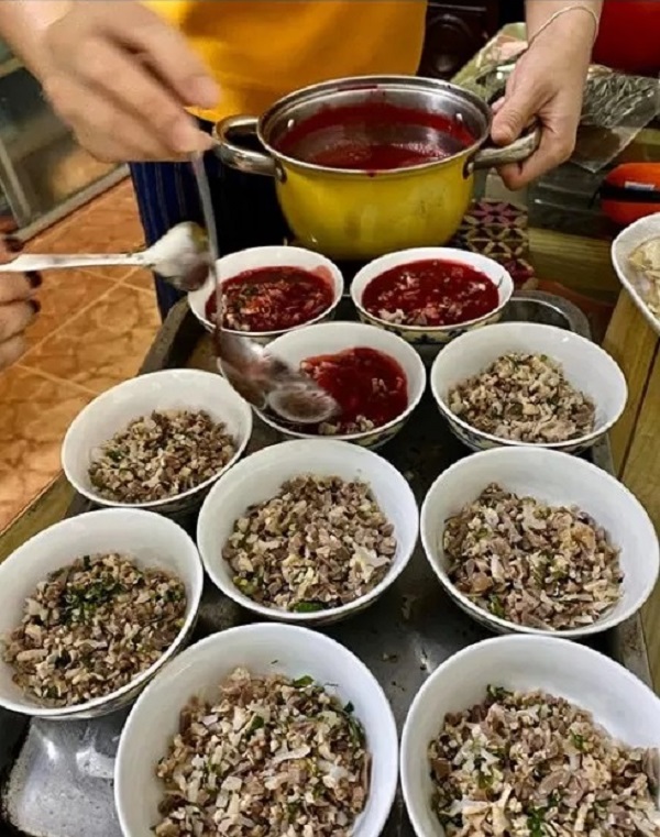 - Trộn hỗn hợp nhân đã thái (hoặc băm) với hành nướng băm nhỏ và rau thơm băm nhỏ. Thêm một chút nước mắm, gia vị, hạt tiêu.