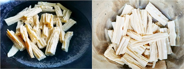 - Bước 2: Đun sôi một nồi nước, cho váng đậu vào chần qua rồi vớt ra thố. Để váng đậu nguội.