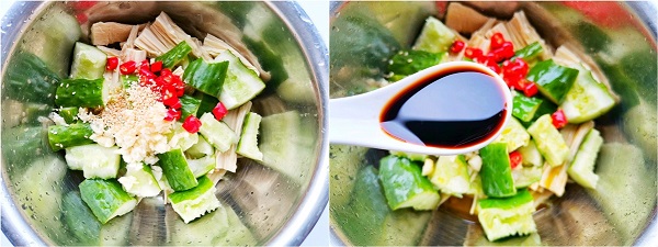 - Bước 3: Thêm dưa chuột, tỏi băm, ớt thái nhỏ, vừng rang và 1 thìa canh dầu ăn đun nóng vào. Tiếp đó đổ 45ml nước tương vào.