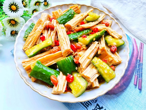 Từng miếng dưa chuột giòn giòn kết hợp với váng đậu mềm ngậy thấm đều gia vị chua, cay, mặn, ngọt giúp tạo cảm giác ngon miệng mà lại tốt cho sức khỏe.