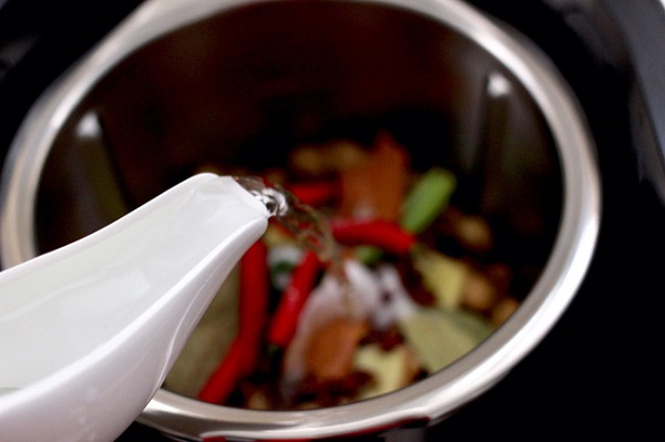 - Bước 3: Tiếp đó cho hoa hồi, lá nguyệt quế, hạt tiêu, quế, ớt, muối, đường vào nồi.