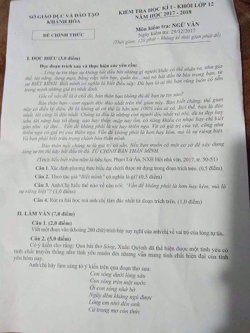 Đề thi môn Văn của Sở Giáo dục Khánh Hòa. Ảnh: VnExpress |
