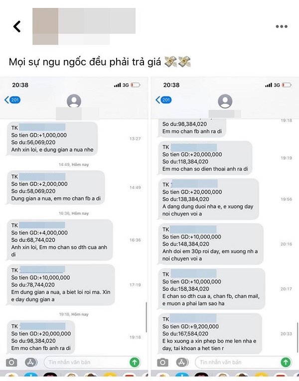 Với mỗi lần chuyển khoản từ vài trăm nghìn, 2 triệu đồng cho đến 10 triệu đồng, anh chàng này đều tỏ ra vô cùng hối lỗi với dòng tin nhắn đầy tha thiết: "Anh xin lỗi em đừng giận anh nữa nhé"/ "Em đừng giận anh nữa, anh biết lỗi rồi. Xin em đừng giận anh."/ "Anh đợi 30 phút rồi đấy, em xuống nhà nói chuyện với anh".