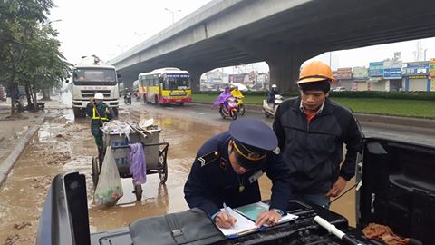 Thanh tra Giao thông huyện Thanh Trì đồng thời yêu cầu Nhà thầu Long Giang phải đảm bảo các yêu cầu về vệ sinh môi trường khi được thi công trở lại như: Phải có cầu rửa xe trước khi lưu thông ra đường, cầu rửa phải đảm bảo nguồn nước và có hệ thống đường dẫn nước thải hợp lý.