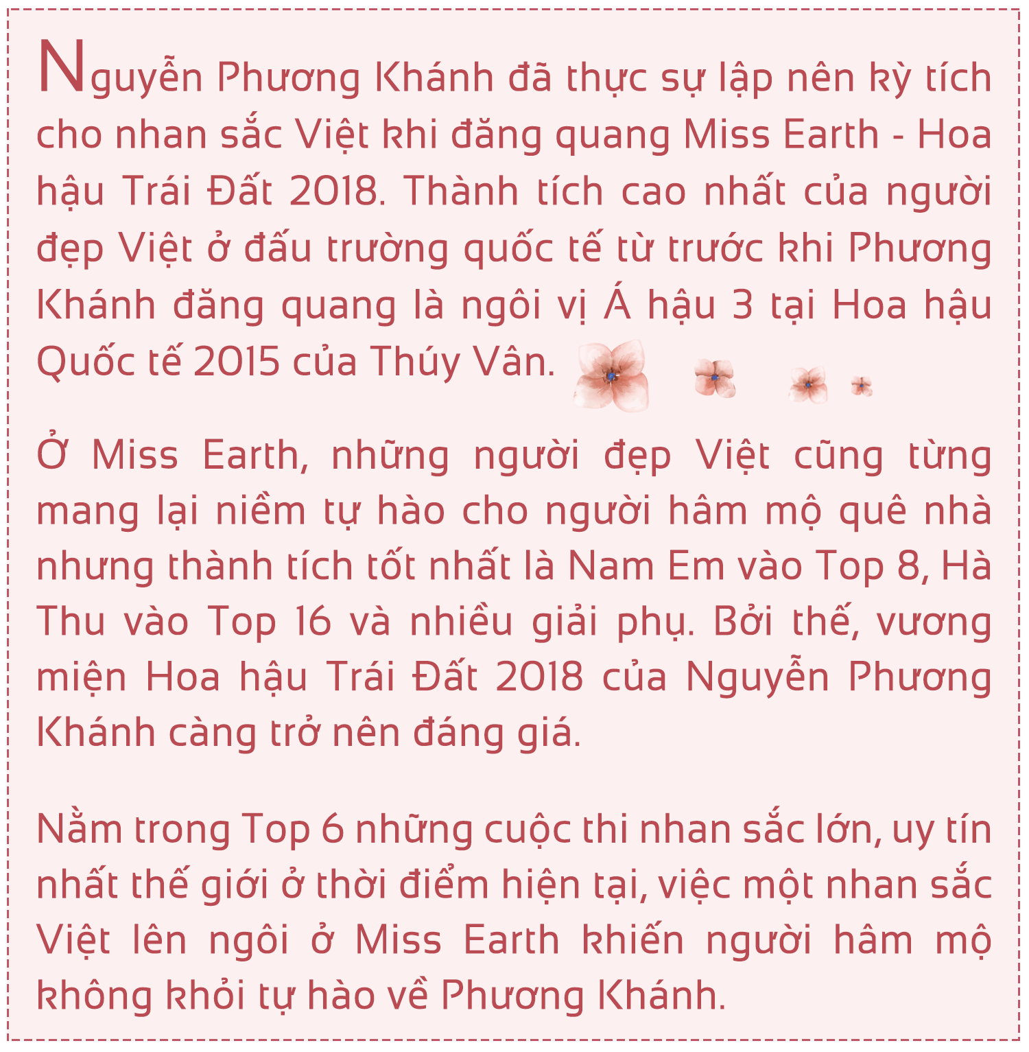 Đối với Phương Khánh, hiện tại chỉ cần mình làm được gì hãy cố gắng hết sức vì danh hiệu Hoa hậu Trái Đất không chỉ thuộc về riêng bản thân tôi mà còn là hình ảnh của một người Việt Nam.