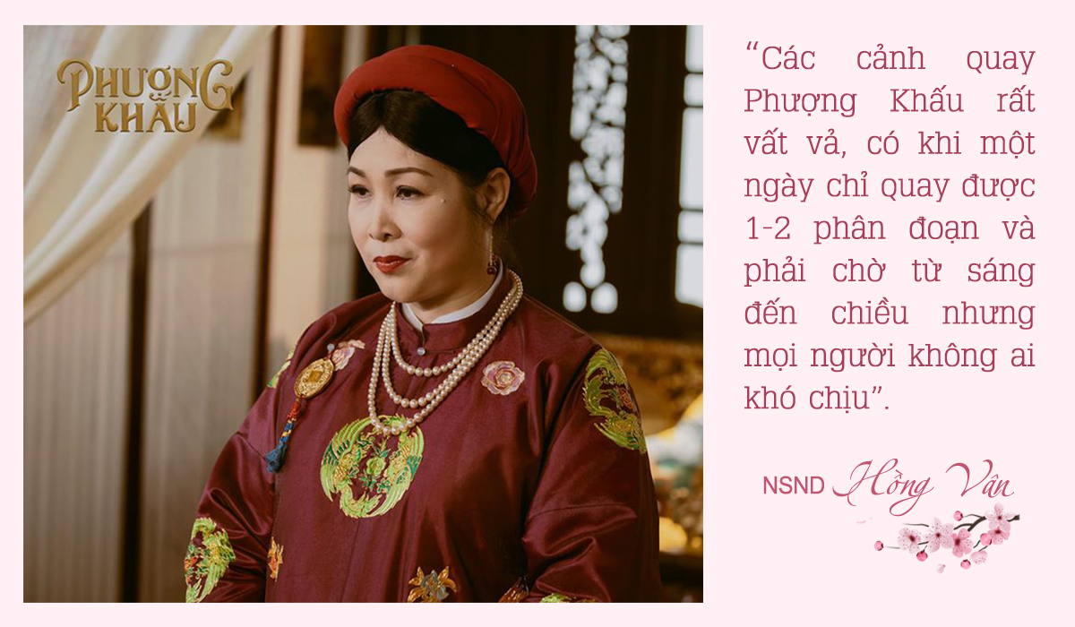 Dù là người có thâm niên trong nghề nhưng thú thật các cảnh quay trong Phượng Khấu rất vất vả. Có khi một ngày chỉ quay được 1-2 phân đoạn và phải chờ từ sáng đến chiều nhưng mọi người không ai khó chịu. Vì những lúc rảnh, những anh chị em nghệ sĩ chúng tôi còn có thể ngồi hàn huyên với bạn giống như trở lại thời thanh xuân. Ngoài ra, bộ phim còn có sự xuất hiện của Minh Trang, Minh Nhí, Long Nhật,..