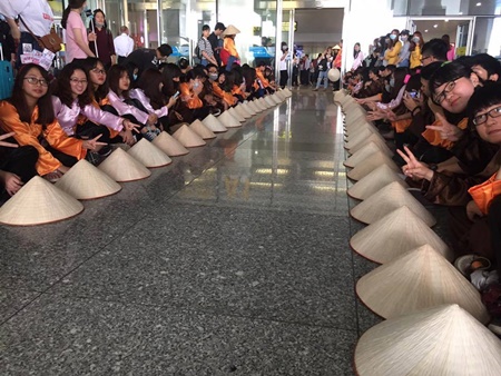 Không chỉ chuẩn bị băng rôn, khẩu hiệu, ảnh của các thành viên, LEGGO còn kỳ công mặc áo bà ba, đội nón lá xếp thành hình chữ EXID để chào đón nhóm.