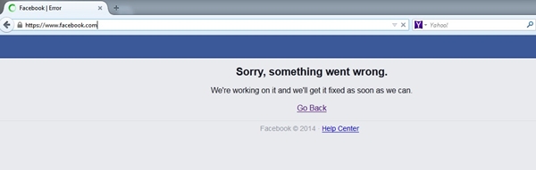 Vào 13h30 chiều nay, khi truy cập vào hệ thống facebook trình duyệt báo không thể kết nối với dòng chữ: "Sorry, something went wrong. We're working on it we'll get it fixed as soon as we can". (Tạm dịch: Xin lỗi, có sai sót đã xảy ra.Chúng tôi sẽ khắc phục trong thời gian sớm nhất có thể".
