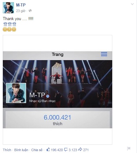 Sơn Tùng nói lời cảm ơn trên trang cá nhân kèm theo bức ảnh chụp lại con số hơn 6 triệu lượt like trên fanpage chính thức của mình. |