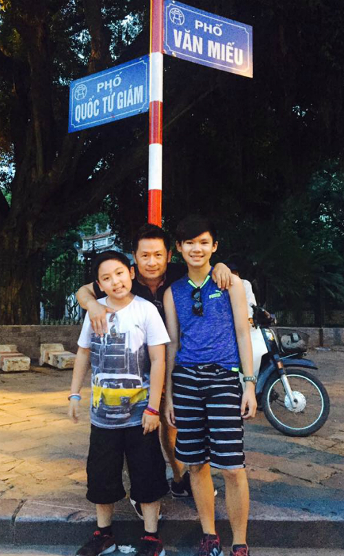 | Bằng Kiều đưa 2 con trai về con phố Quốc Tử Giám - Văn Miếu - nơi anh sinh sống lúc nhỏ: "Về "quê" của bố, 2 anh có vẻ thích". |