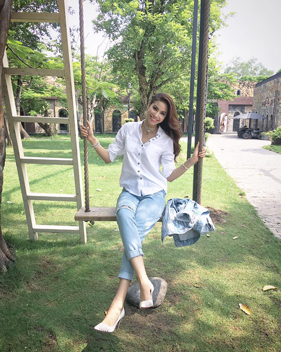 | Phạm Hương giản dị với quần jeans, sơ mi trắng tranh thủ ra xích đu chơi trong lúc được nghỉ giải lao khi ghi hình. |