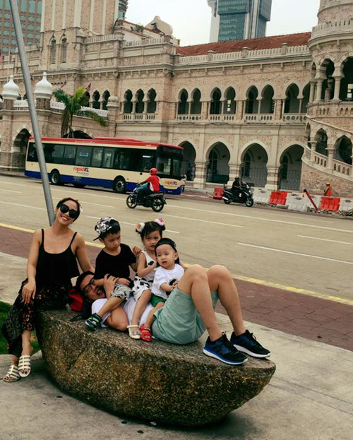 | Gia đình Ốc Thanh Vân đang cho đàn con du hí Malaysia, cả nhà chụp hình lưu niệm ở trung tâm thủ đô Kuala Lumpur. |