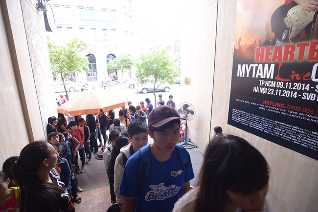 Lường trước sức nóng “khủng” của live show sau khi 35.000 vé tại khu vực TP.HCM được đăng ký "sạch" trong ngày đầu tiên mở đăng ký trên website, ngoài điểm nhận vé tại trụ sở công ty giải trí Mỹ Tâm, đơn vị đồng hành OPPO Smartphone đã bố trí thêm 6 điểm nhận vé nhưng bộ phận phát vé cũng phải làm việc khá vất vả vì lượng fan hâm mộ đến khá đông.