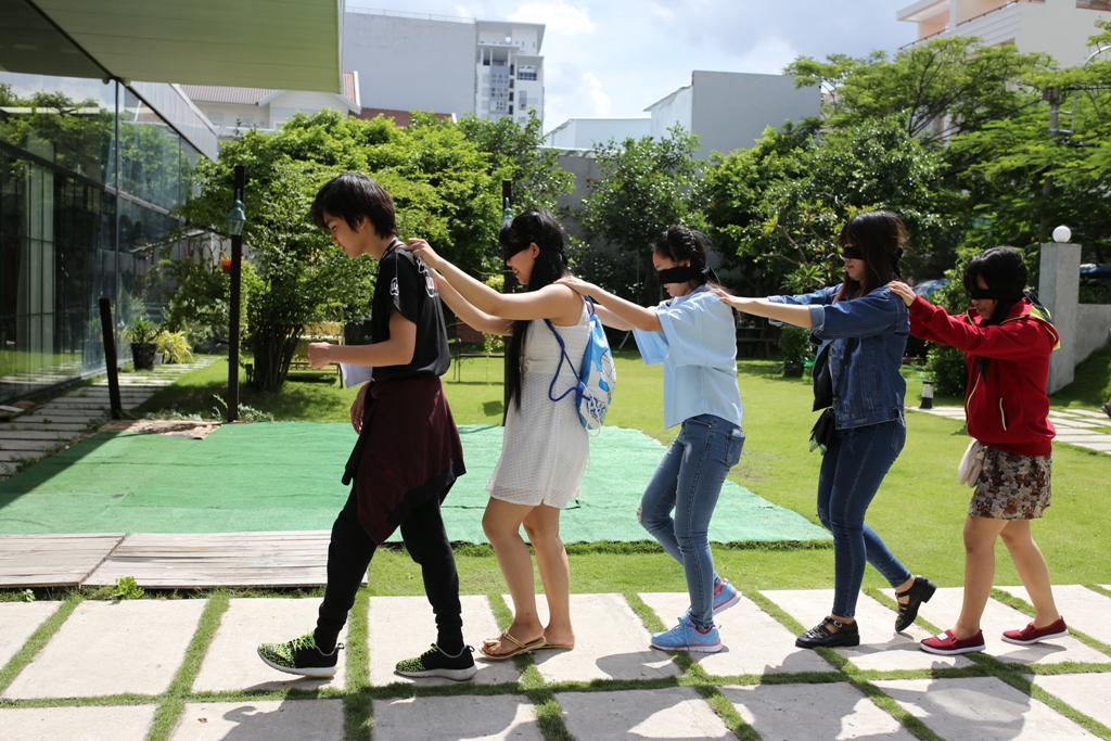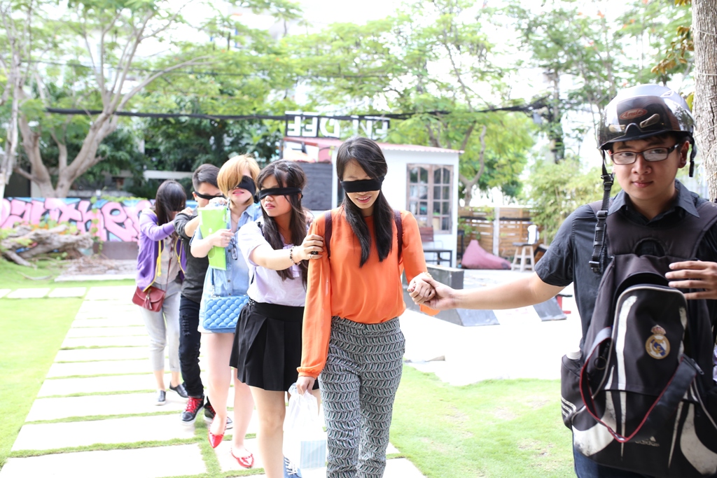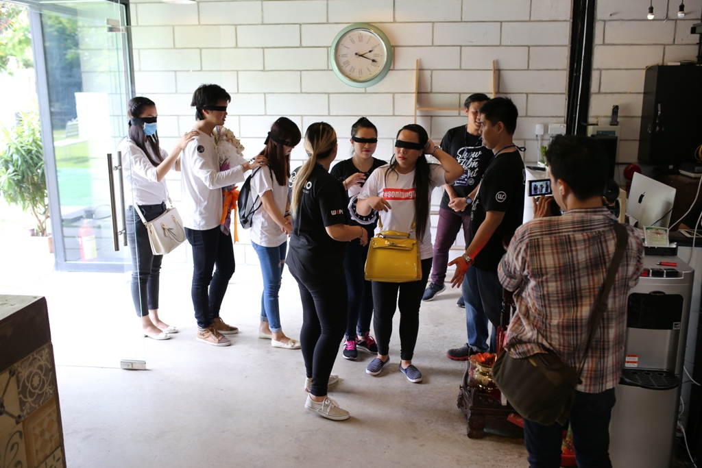 Fan bị bịt kín mắt khi được dẫn vào xem buổi Live Streaming của Sơn Tùng. |