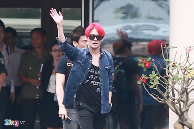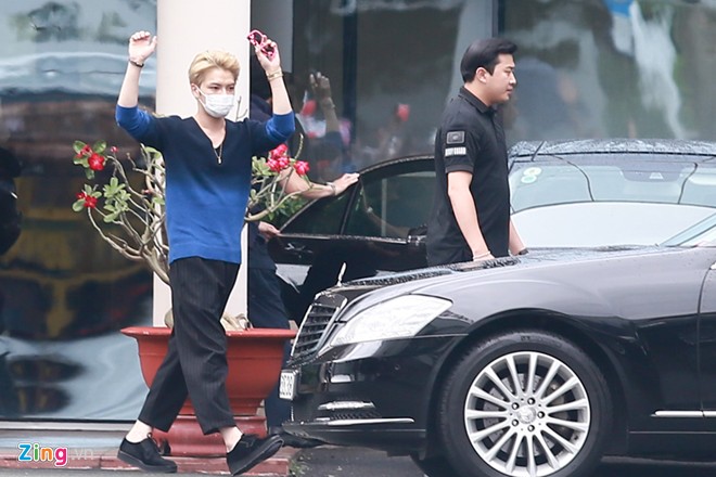 | Ngay khi bước ra khỏi sảnh chờ, dù đeo bịt mặt nhưng Jaejoong vẫn vẫy tay chào các fan đang đứng chờ đợi nhóm ở khu vực cổng ra vào. |