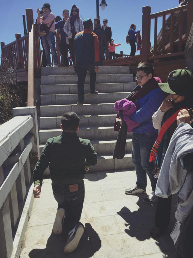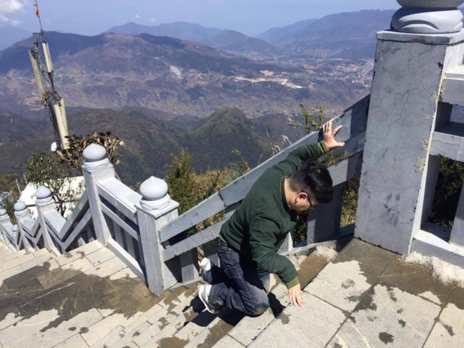 “Bắt đầu phải bỏ xe lăn lại phía sau để lên đỉnh, tôi phải qua khoảng hơn 600 bậc đá nữa. Những bậc đá đó không thấp và dễ đi như ở cực Bắc Lũng Cú, mà cao khoảng 20 cm, và sâu chỉ khoảng 15 cm.