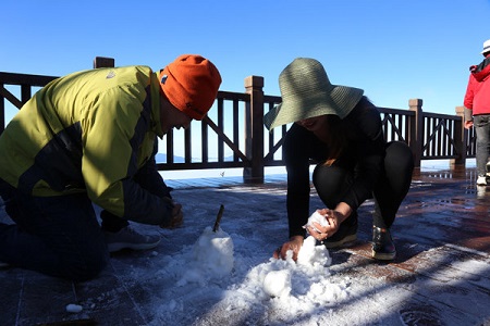 Du khách tham quan sáng 19/12 sẽ bất ngờ và ấn tượng khi không gian thiên nhiên, cây cỏ, chóp tam giác trên đỉnh 3.143m, khu vực sàn gỗ quanh đỉnh, các bậc thang lên đỉnh,… phủ kín lớp băng tuyết dày trắng xóa.
