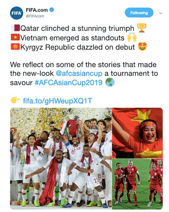 Mới đây, Liên đoàn bóng đá thế giới (FIFA) đã có bài viết về giải Asian Cup 2019, trong đó đánh giá tuyển Qatar (đương kim vô địch) và tuyển Việt Nam là 2 đội bóng đã thì đấu nổi bật và gây nhiều cảm xúc cho người hâm mộ châu Á.
