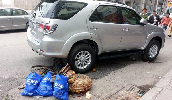 (ĐSPL) - Chiếc xe Toyota Fortuner mới cứng cuốn người phụ nữa đi xe đạp bán hàng rong vào gầm xe và nghiến gãy hai chân của chị này tại ngã ba Cát Linh, Đống Đa, Hà Nội.