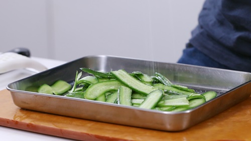 Dưa chuột nạo lát mỏng, ướp với muối và dầu ô liu.