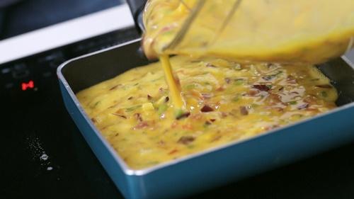 Đánh tan lòng đỏ và lòng trắng trứng. Thêm xúc xích pepperoni, hành tây, ớt chuông xanh + đỏ, lá húng tây và trộn đều. Nhớ bớt lại chút hành tây, ớt… để làm trang trí cuối cùng cho món ăn.