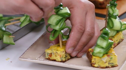 Xiên dưa chuột để tạo thành hình cây Giáng. Cắm cây dưa chuột lên trên miếng frittata. Rắc nốt số hành tây, ớt xanh + đỏ còn lại.
