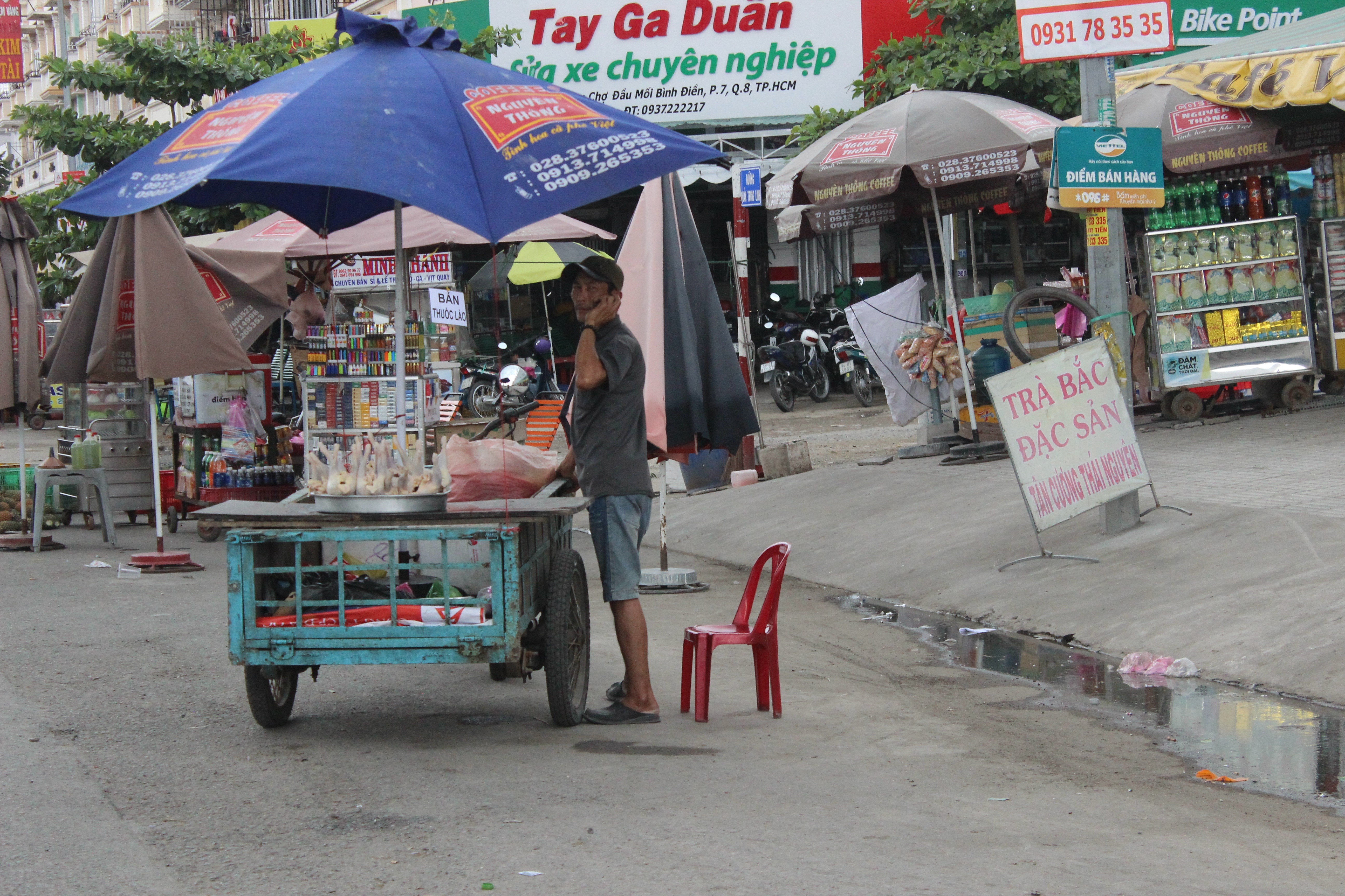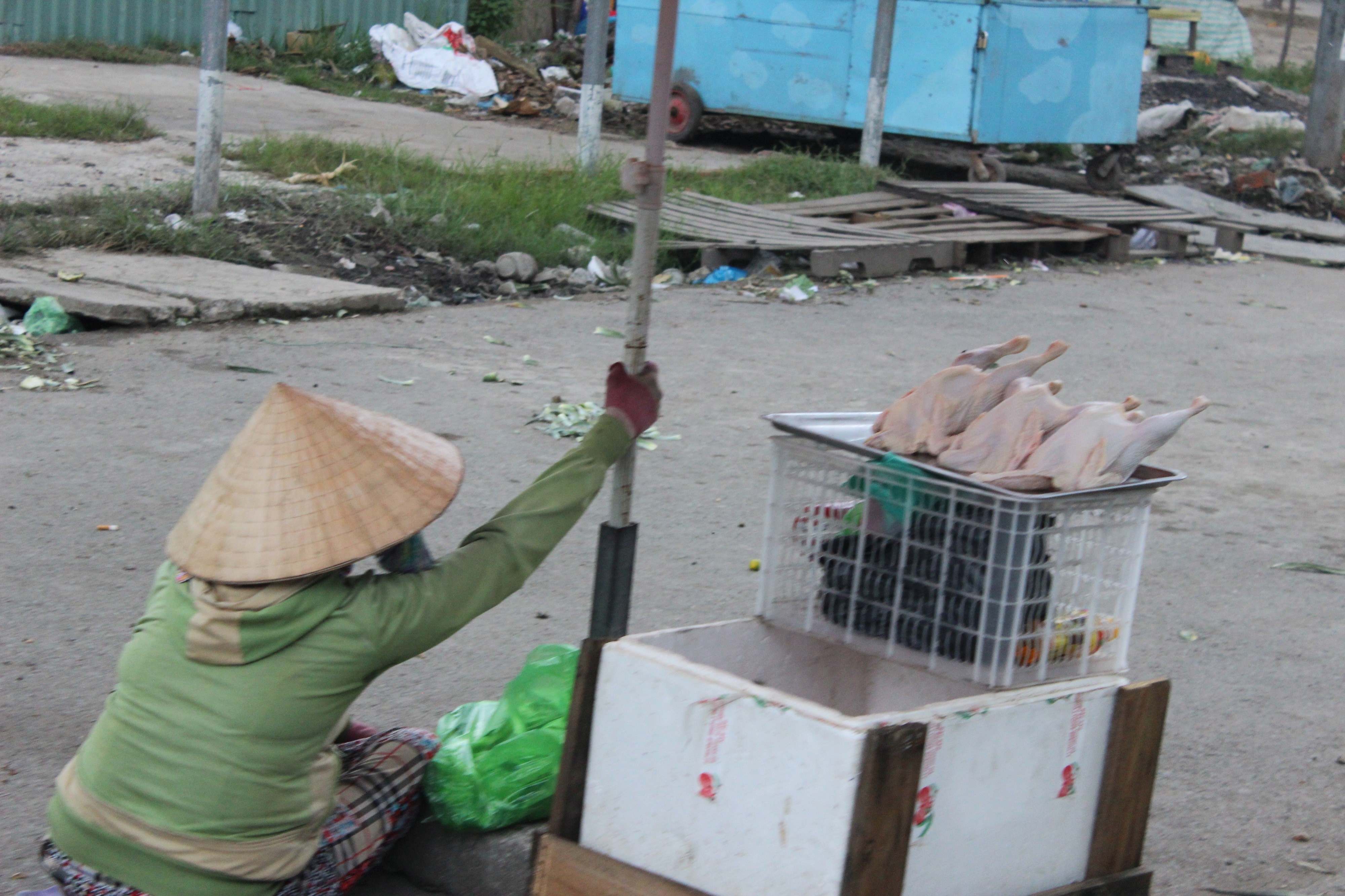 Cứ cách 50m theo đường dẫn vào chợ đầu mối Bình Điền lại có thêm một sạp hàng bán “gà mái đẻ” theo cùng một cách chào mời. |